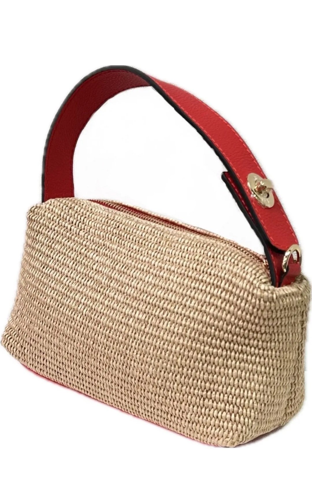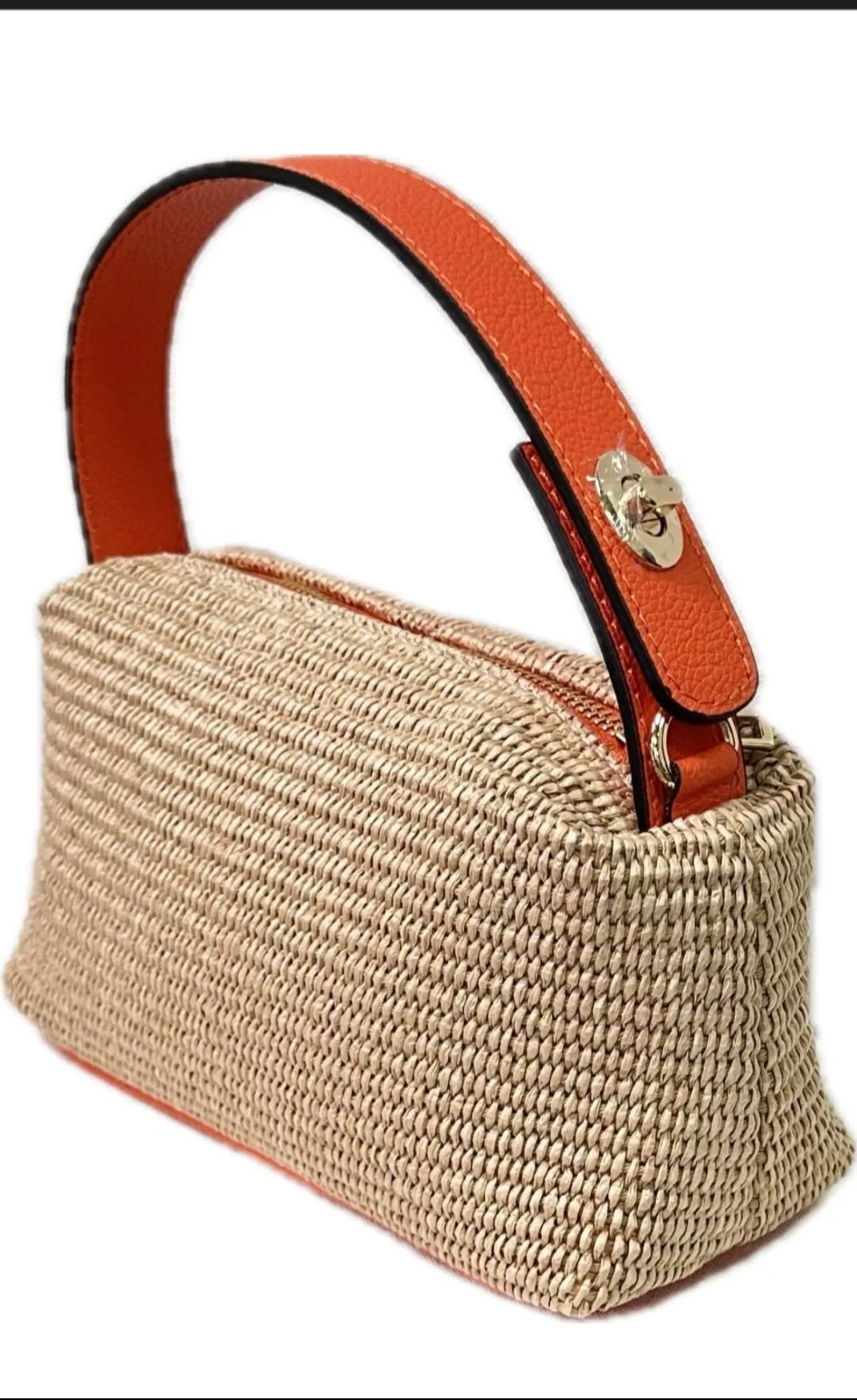 Bolso de rafia color natural,con correas de piel en dos colores, naranja y rojo,se hace tb bandolera.Medidas sproximadas 20×20