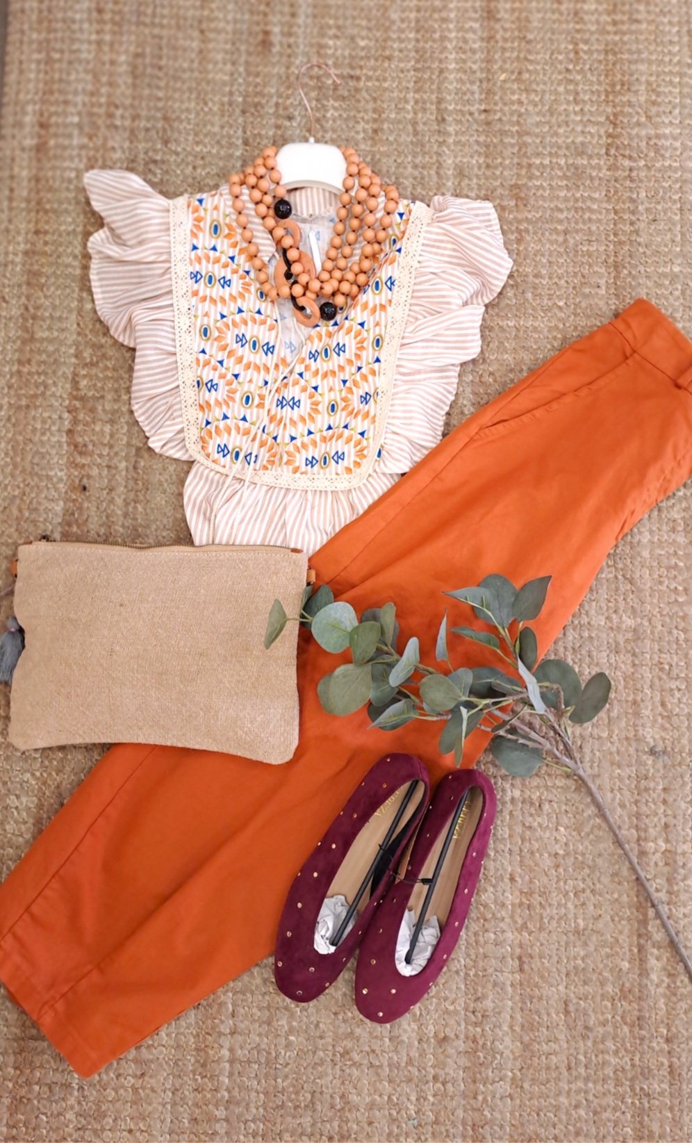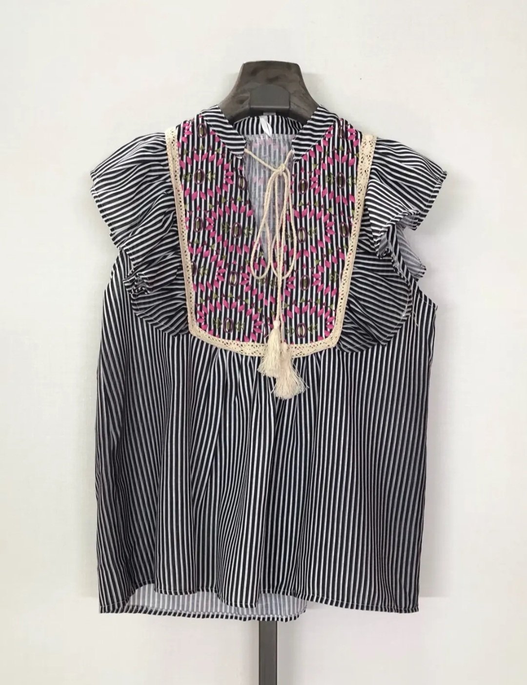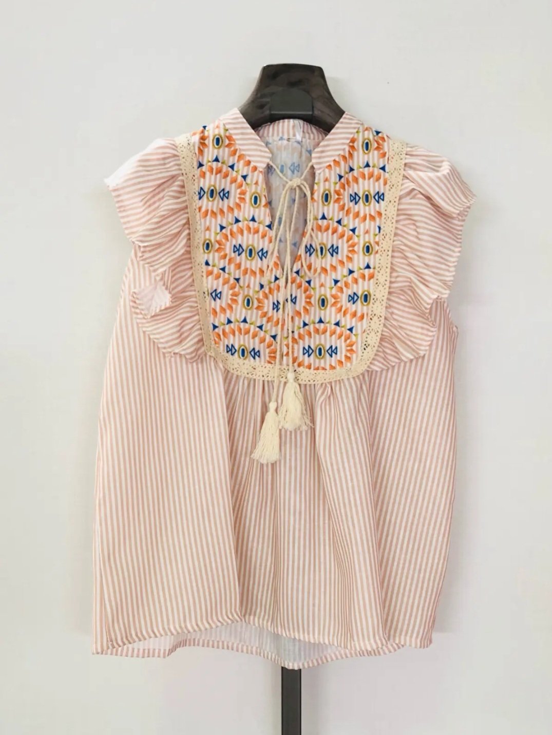 Camisa talla unica con volantes en los hombros y rayas, bordado central con cordon para ajustar.
