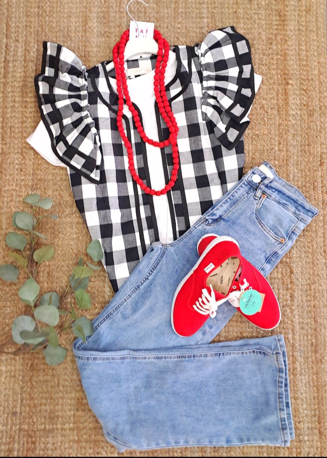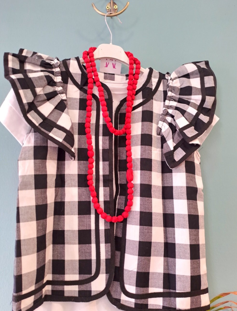 Chaleco de cuadros vichy en color blanco y negro con volantes en los hombros.
