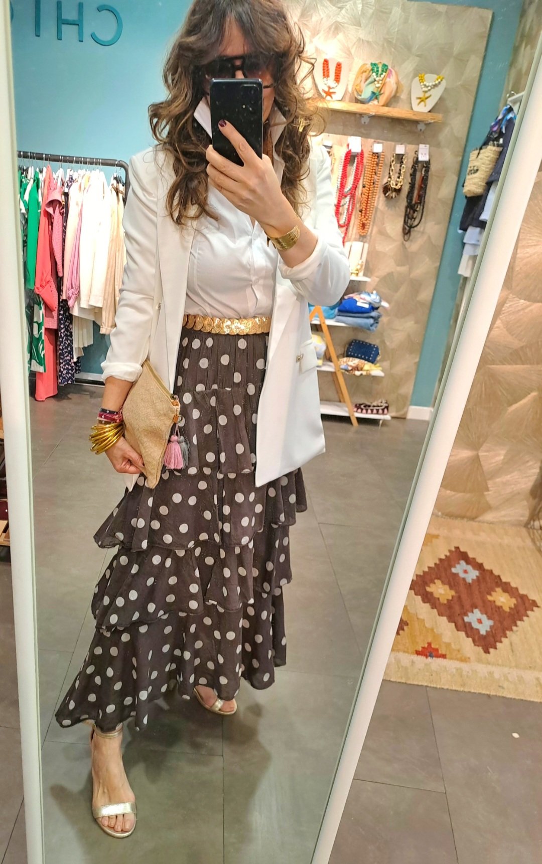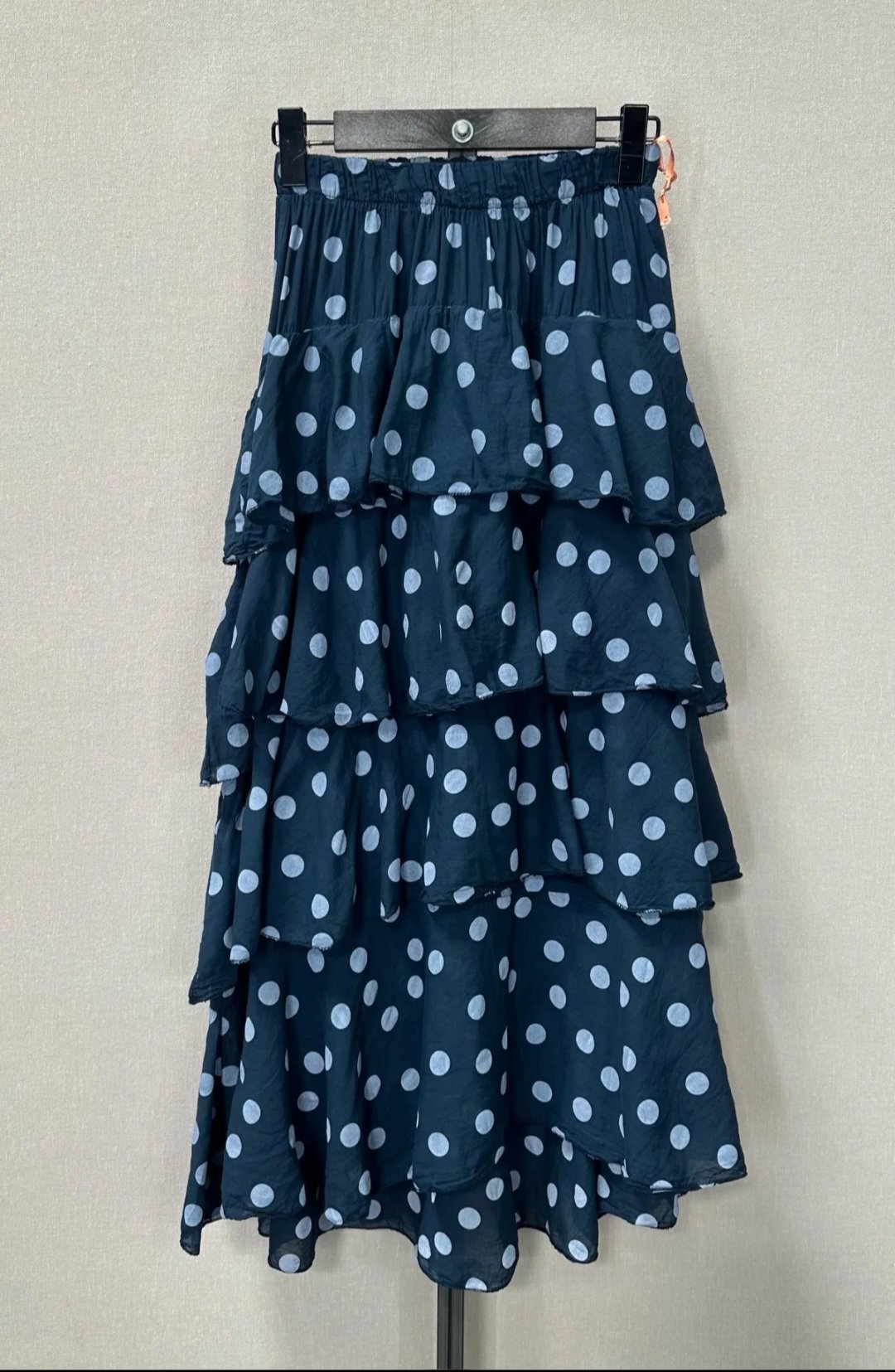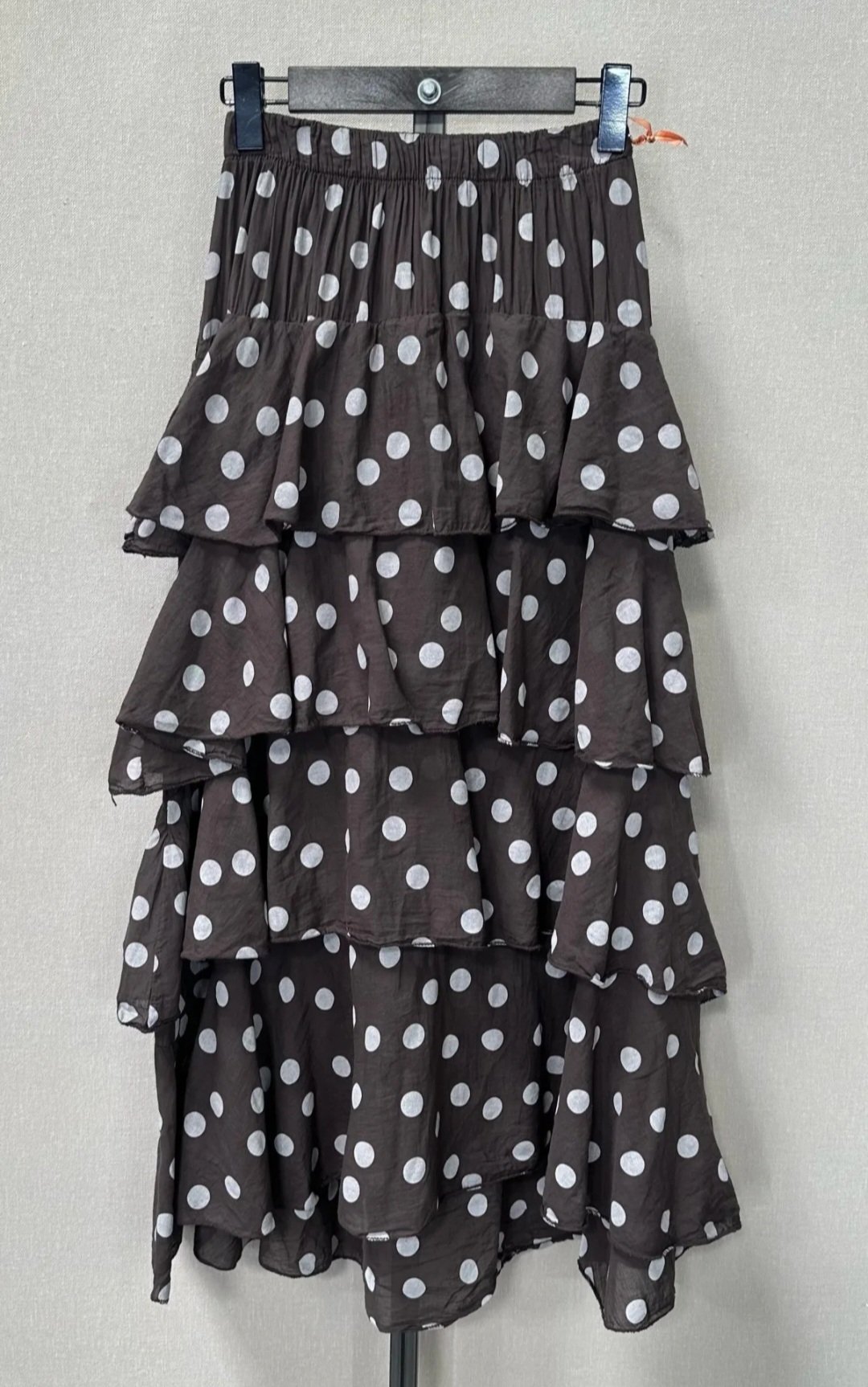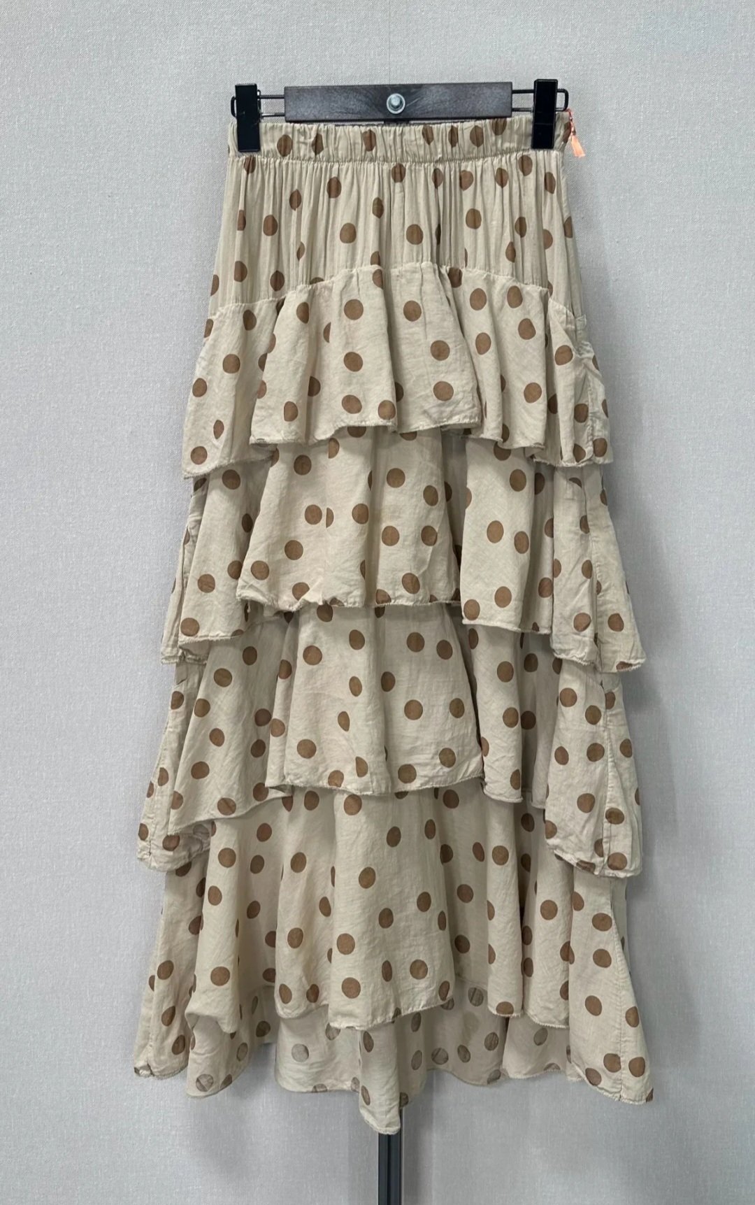 Falda de lunares y volantes .Corte Midie y talla unica,elastica ,engomada en la cintura, tres colores ,azul, marron chocolate y beige.Ideal para tus eventos.